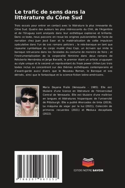 Trois essais pour entrer en contact avec la littérature la plus innovante du Cône Sud. Quatre des auteurs les plus intéressants du Chili, de l'Argentine et de l'Uruguay sont analysés dans leur esthétique explosive et brillante. Dans ce texte, nous passons en revue les origines pulsionnelles de l'acte de narration chez Juan José Saer et la matérialisation de cette impulsion spéculative dans l'un de ses romans policiers ; le néo-baroque en tant que royaume symbolique du corps mutilé chez Copi, un écrivain qui imite le baroque retruecano dans les faralados du costume de monstre de foire ; et l'instrumentalisation de la corporalité féminine dans deux romans de Felisberto Hernández et Jorge Baradit, le premier étant un artiste uruguayen au style unique et le second un représentant du freak power chilien.Les trois textes inclus se concentrent sur des thèmes esthétiques contemporains et d'avant-garde aussi divers que le Nouveau Roman, le Baroque et ses dérivés, ainsi que le fantastique et la science-fiction latino-américains.