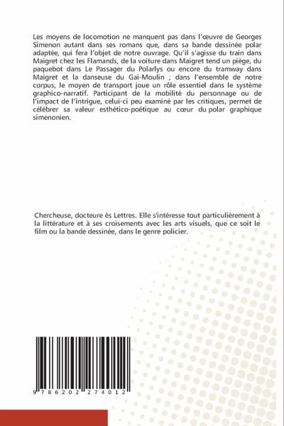 Les moyens de locomotion ne manquent pas dans l'oeuvre de Georges Simenon autant dans ses romans que, dans sa bande dessinée polar adaptée, qui fera l'objet de notre ouvrage. Qu'il s'agisse du train dans Maigret chez les Flamands, de la voiture dans Maigret tend un piège, du paquebot dans Le Passager du Polarlys ou encore du tramway dans Maigret et la danseuse du Gai-Moulin ; dans l'ensemble de notre corpus, le moyen de transport joue un rôle essentiel dans le système graphico-narratif. Participant de la mobilité du personnage ou de l'impact de l'intrigue, celui-ci peu examiné par les critiques, permet de célébrer sa valeur esthético-poétique au coeur du polar graphique simenonien.