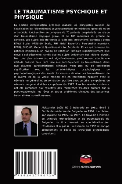 La section d'introduction présente d'abord les principales raisons de l'application du raisonnement psychosomatique en médecine générale et en orthopédie. L'échantillon se compose de 70 patients hospitalisés en raison d'un traumatisme physique grave, et de 105 membres du groupe de contrôle. Les sujets ont été testés à l'aide des instruments suivants : Event Effect Scale, PTSS-10 Scale, FHI, Brief Eysenck's Personality Inventory, LEAIQ, GHQ-60, General Questionnaire for Accidents. En ce qui concerne les patients immobiles, un niveau de cohésion familiale significativement plus élevé a été déterminé, tandis que les sujets présentant des lésions aiguës, bien que plus extravertis, ont significativement plus souvent adopté une attitude passive pour faire face aux conséquences du traumatisme. Alors que d'autres caractéristiques cliniques n'ont pas eu de corrélation significative avec les caractéristiques psychologiques ou psychopathologiques des sujets. Le contenu de rêve des traumatismes, de la guerre et de la vieille maison est en corrélation négative avec le névrosisme général et en corrélation positive avec certains symptômes de névrosisme général et les symptômes du SSPT. Tous les résultats obtenus ont été comparés aux résultats des recherches d'autres auteurs sur la psychopathologie, les rêves et autres problèmes cliniques des personnes traumatisées somatiquement.