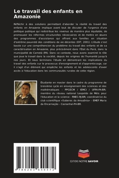 Réfléchir à des solutions permettant d'aborder la réalité du travail des enfants en Amazonie implique avant tout de discuter de l'urgence d'une politique publique qui redistribue les revenus de manière plus équitable, de promouvoir les réformes structurelles nécessaires et de mettre en oeuvre des programmes d'assistance qui offrent aux familles en situation d'extrême pauvreté des conditions de vie décentes (OIT, 2001). L'étude s'est basée sur une compréhension du problème du travail des enfants et de sa caractérisation en Amazonie, plus précisément dans l'État du Pará, dans la municipalité de Cametá (PA). Dans ce contexte, nous avons examiné le rôle que joue le travail dans la société, depuis les origines de l'humanité jusqu'à nos jours. Et nous terminons l'étude en démontrant les implications du travail des enfants sur le processus d'enseignement et d'apprentissage, car il s'agit d'un élément qui empêche les enfants et les adolescents d'avoir accès à l'éducation dans les communautés rurales de cette région.