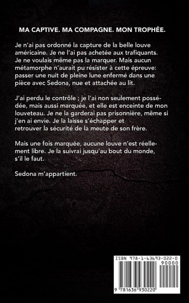 MA CAPTIVE. MA COMPAGNE. MON TROPHÉE. Je n'ai pas ordonné la capture de la belle louve américaine. Je ne l'ai pas achetée aux trafiquants. Je ne voulais même pas la marquer. Mais aucun métamorphe n'aurait pu résister à cette épreuve : passer une nuit de pleine lune enfermé dans une pièce avec Sedona, nue et attachée au lit. J'ai perdu le contrôle ; je l'ai non seulement possédée, mais aussi marquée, et elle est enceinte de mon louveteau. Je ne la garderai pas prisonnière, même si j'en ai envie. Je la laisse s'échapper et retrouver la sécurité de la meute de son frère. Mais une fois marquée, aucune louve n'est réellement libre. Je la suivrai jusqu'au bout du monde, s'il le faut. Sedona m'appartient.