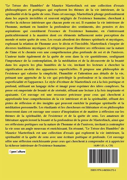 "Le Trésor des Humbles" de Maurice Maeterlinck est une collection d'essais philosophiques et poétiques qui explorent les thèmes de la vie intérieure, de la spiritualité et de la quête de sens. Dans cet ouvrage, Maeterlinck plonge profondément dans les aspects invisibles et souvent négligés de l'existence humaine, cherchant à révéler la richesse intérieure que chacun porte en soi. Il examine la vie intérieure de l'homme, mettant en lumière la profondeur des sentiments, des pensées et des aspirations qui constituent l'essence de l'existence humaine, en s'intéressant particulièrement à la manière dont ces éléments influencent notre perception du monde et notre quête de sens. Les essais abordent des thèmes spirituels et mystiques, explorant la relation de l'homme avec le divin et l'invisible. Maeterlinck s'inspire de diverses traditions mystiques et religieuses pour illustrer ses réflexions sur la nature de l'âme et le chemin vers une compréhension plus profonde de soi et de l'univers. L'auteur traite également de la quête de sens dans la vie quotidienne, soulignant l'importance de la contemplation, de la méditation et de la découverte de la beauté dans les aspects les plus humbles de la vie, invitant les lecteurs à chercher la signification au-delà des apparences superficielles. Il propose une philosophie de l'existence qui valorise la simplicité, l'humilité et l'attention aux détails de la vie, prônant une approche de la vie qui privilégie la profondeur et la sincérité sur la superficialité et l'apparence. Le style d'écriture de Maeterlinck est à la fois poétique et profond, utilisant un langage riche et imagé pour exprimer des idées complexes. Sa prose est empreinte de beauté et de sérénité, offrant une lecture à la fois inspirante et apaisante. Cet ouvrage est une ressource précieuse pour ceux qui cherchent à approfondir leur compréhension de la vie intérieure et de la spiritualité, offrant des pistes de réflexion et des insights qui peuvent enrichir la pratique spirituelle et la méditation personnelle. Les étudiants et les chercheurs en littérature et en philosophie trouveront dans cet ouvrage une source d'inspiration et de matière à réflexion sur les thèmes de la spiritualité, de l'existence et de la quête de sens. Les amateurs de littérature apprécieront la beauté et la profondeur de la prose de Maeterlinck, ainsi que ses réflexions poétiques sur la nature de l'homme et de l'univers, invitant à contempler la vie sous un angle nouveau et enrichissant. En résumé, "Le Trésor des Humbles" de Maurice Maeterlinck est une collection d'essais qui explorent la vie intérieure, la spiritualité et la quête de sens avec une écriture poétique et profonde. Cet ouvrage offre une réflexion enrichissante pour ceux qui cherchent à comprendre et à apprécier la richesse intérieure de l'existence humaine.