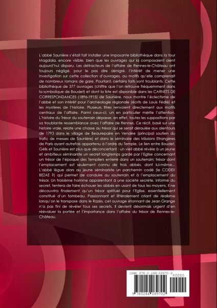L'abbé Saunière s'était fait installer une bibliothèque dans la tour Magdala. Dans la liste des 377 ouvrages qui la composaient, l'histoire du Trésor du souterrain étonne par sa troublante ressemblance avec l'affaire de Rennes. Il relate une chasse au trésor dans un petit village de Vendée et dans le séminaire des Missions Etrangères de Paris ayant appartenu à l'ordre du Temple. Le lien entre Boudet, Gélis et Saunière est plus que déconcertant : un vieil abbé révèle à un jeune et ambitieux séminariste un secret longtemps gardé par l'Eglise concernant un trésor de l'époque des Templiers dont l'emplacement est seulement connu de trois abbés, dont lui-même... L'abbé lègue au jeune séminariste un parchemin codé permettant de conduire vers un souterrain et l'emplacement d'un trésor spirituel pour l'Eglise. Passionnant et troublant lorsqu'on le transpose dans le Razès, cet ouvrage étonnant n'a pas fini de révéler tous ses secrets. Il devient urgent d'en réévaluer l'importance dans l'affaire de Rennes-le-Château.