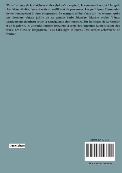 "Dans l¿attente de la fraîcheur et de celui qüon espérait, la conversation vint à languir chez Mme Alviña, lasse d¿avoir accueilli tant de personnes. Les politiques, Hernandez même, renoncèrent à leurs éloquences. Le marquis d¿Oro s¿essuyait les tempes après une dernière phrase jaillie de sa grande barbe blanche. Marbre svelte, Vénus Anadyomène dominait seule la nonchalance des causeurs. Sur les sièges de la rotonde et de la galerie, les attitudes lourdes fripaient la serge des jaquettes, la mousseline des robes. Les flirts se fatiguaient. Tous babillages se turent. Des sorbets achevèrent de fondre."…mehr