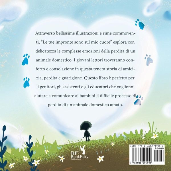 Translated in Italian: Through beautiful illustrations and heartwarming rhyme, "Your Pawprints Are on My Heart" gently explores the complex emotions of losing a pet. Young readers will find comfort and solace in this tender tale of friendship, loss, and healing. This book is perfect for parents, caregivers, and educators who want to help communicate with children the difficult process of losing a beloved pet.