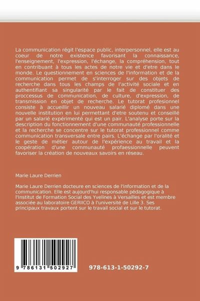 La communication régit l'espace public, interpersonnel, elle est au coeur de notre existence favorisant la connaissance, l'enseignement, l'expression, l'échange, la compréhension, tout en contribuant à tous les actes de notre vie et d'etre dans le monde. Le questionnement en sciences de l'information et de la communication permet de s'interroger sur des objets de recherche dans tous les champs de l'activité sociale et en authentifiant sa singularité par le fait de constituer des proccessus de communication, de culture, d'expression, de transmission en objet de recherche. Le tutorat profesionnel consiste à accueillir un nouveau salarié diplomé dans une nouvelle institution en lui permettant d'etre soutenu et conseillé par un salarié expérimenté qui est un pair. L'analyse porte sur la description du fonctionnement d'une communauté professionnelle et la recherche se concentre sur le tutorat professionnel comme communication transversale entre pairs. L'échange par l'oralité et le geste de métier autour de l'expérience au travail et la coopération d'une communauté profaessionnelle peuvent favoriser la création de nouveaux savoirs en réseau.