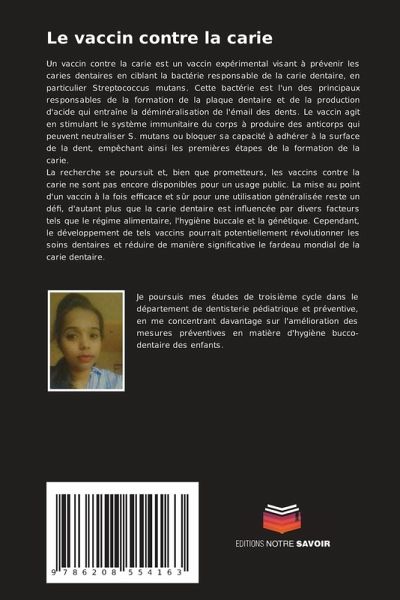 Un vaccin contre la carie est un vaccin expérimental visant à prévenir les caries dentaires en ciblant la bactérie responsable de la carie dentaire, en particulier Streptococcus mutans. Cette bactérie est l'un des principaux responsables de la formation de la plaque dentaire et de la production d'acide qui entraîne la déminéralisation de l'émail des dents. Le vaccin agit en stimulant le système immunitaire du corps à produire des anticorps qui peuvent neutraliser S. mutans ou bloquer sa capacité à adhérer à la surface de la dent, empêchant ainsi les premières étapes de la formation de la carie.La recherche se poursuit et, bien que prometteurs, les vaccins contre la carie ne sont pas encore disponibles pour un usage public. La mise au point d'un vaccin à la fois efficace et sûr pour une utilisation généralisée reste un défi, d'autant plus que la carie dentaire est influencée par divers facteurs tels que le régime alimentaire, l'hygiène buccale et la génétique. Cependant, le développement de tels vaccins pourrait potentiellement révolutionner les soins dentaires et réduire de manière significative le fardeau mondial de la carie dentaire.