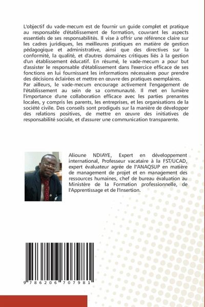 L'objectif du vade-mecum est de fournir un guide complet et pratique au responsable d'établissement de formation, couvrant les aspects essentiels de ses responsabilités. Il vise à offrir une référence claire sur les cadres juridiques, les meilleures pratiques en matière de gestion pédagogique et administrative, ainsi que des directives sur la conformité, la qualité, et d'autres domaines critiques liés à la gestion d'un établissement éducatif. En résumé, le vade-mecum a pour but d'assister le responsable d'établissement dans l'exercice efficace de ses fonctions en lui fournissant les informations nécessaires pour prendre des décisions éclairées et mettre en oeuvre des pratiques exemplaires.Par ailleurs, le vade-mecum encourage activement l'engagement de l'établissement au sein de sa communauté. Il met en lumière l'importance d'une collaboration efficace avec les parties prenantes locales, y compris les parents, les entreprises, et les organisations de la société civile. Des conseils sont prodigués sur la manière de développer des relations positives, de mettre en oeuvre des initiatives de responsabilité sociale, et d'assurer une communication transparente.