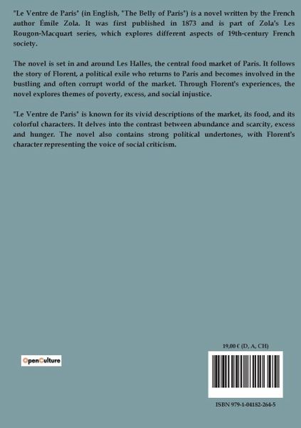 "Le Ventre de Paris" d'Émile Zola est un roman qui s'inscrit dans la série des Rougon-Macquart, une fresque naturaliste dépeignant la société française sous le Second Empire. L'histoire débute avec Florent, un homme maigre et affamé, qui revient à Paris après s'être échappé de Cayenne, où il avait été déporté à la suite des événements politiques de décembre 1851. Florent est recueilli par une maraîchère, Madame François, qui le conduit aux Halles centrales de Paris, un lieu figurant l'abondance et la vie urbaine. À travers les yeux de Florent, Zola décrit avec minutie le marché des Halles, ses couleurs, ses odeurs, et l'activité incessante qui s'y déroule. Le roman explore les contrastes entre l'opulence débordante de nourriture et la misère de ceux qui en sont privés. Florent, en quête de rédemption et de justice, se retrouve impliqué dans les intrigues et les luttes de pouvoir qui animent ce microcosme. Zola utilise les Halles comme une métaphore du ventre de Paris, un lieu où se concentrent les tensions sociales et économiques de l'époque. Le roman est une critique acerbe de la société bourgeoise et de ses excès, tout en offrant une peinture vivante et détaillée de la vie quotidienne dans la capitale française.