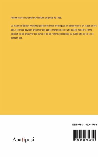 Réimpression inchangée de l'édition originale de 1868. La maison d'édition Anatiposi publie des livres historiques en réimpression. En raison de leur âge, ces livres peuvent présenter des pages manquantes ou une qualité moindre. Notre objectif est de préserver ces livres et de les rendre accessibles au public afin qu'ils ne se perdent pas.
