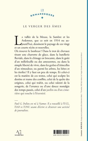 La vallée de la Meuse, la Sambre et les Ardennes, que ce soit en 1914 ou aujourd¿hui, dessinent le paysage de ces vingt et un courts récits et nouvelles. Où trouver le bonheur ? Dans le trot de chevaux tirant une charrette de glace, dans la batellerie fluviale, dans le chinage en brocante, dans le goût d¿un millefeuille ou des amourettes, ou dans la simple liberté de vivre, dans les gerbes d¿étincelles d¿un rémouleur, ou parmi les arbres, les bêtes et les étoiles ? Il y faut un peu de temps. Et celui-ci est la matière de ces textes, celui qui sculpte les destins et trame des conflits, celui de la quête des origines, celui qui trahit, ou celui ralenti de la songerie, de l¿errance ou d¿une douce nostalgie des temps passés, celui d¿un jardin ou d¿un cimetière qui touche à l¿éternité. Paul G. Dulieu est né à Namur. Il a travaillé à l¿UCL, l¿IAD et l¿ONU avant d¿écrire et d¿exercer une activité de journaliste.