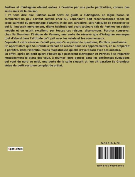 Porthos et d'Artagnan étaient entrés à l'évêché par une porte particulière, connue des seuls amis de la maison. Il va sans dire que Porthos avait servi de guide à d'Artagnan. Le digne baron se comportait un peu partout comme chez lui. Cependant, soit reconnaissance tacite de cette sainteté du personnage d'Aramis et de son caractère, soit habitude de respecter ce qui lui imposait moralement, digne habitude qui avait toujours fait de Porthos un soldat modèle et un esprit excellent, par toutes ces raisons, disons-nous, Porthos conserva, chez Sa Grandeur l'évêque de Vannes, une sorte de réserve que d'Artagnan remarqua tout d'abord dans l'attitude qu'il prit avec les valets et les commensaux. Cependant cette réserve n'allait pas jusqu'à se priver de questions, Porthos questionna. On apprit alors que Sa Grandeur venait de rentrer dans ses appartements, et se préparait à paraître, dans l'intimité, moins majestueuse qu'elle n'avait paru avec ses ouailles. En effet, après un petit quart d'heure que passèrent d'Artagnan et Porthos à se regarder mutuellement le blanc des yeux, à tourner leurs pouces dans les différentes évolutions qui vont du nord au midi, une porte de la salle s'ouvrit et l'on vit paraître Sa Grandeur vêtue du petit costume complet de prélat.