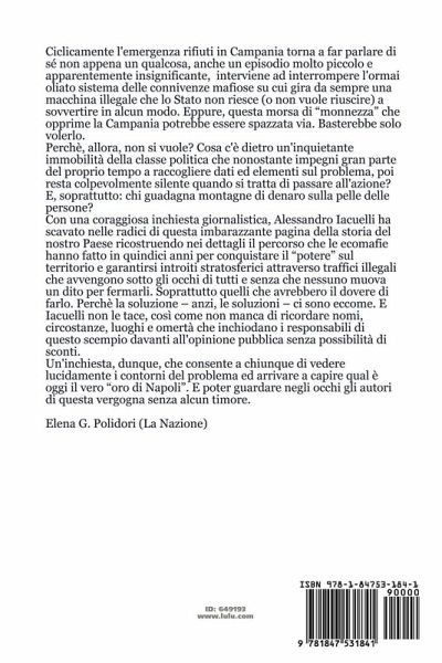 Ciclicamente l'emergenza rifiuti in Campania torna a far parlare di sé non appena un qualcosa, anche un episodio molto piccolo e apparentemente insignificante, interviene ad interrompere l'ormai oliato sistema delle connivenze mafiose su cui gira da sempre una macchina illegale che lo Stato non riesce (o non vuole riuscire) a sovvertire in alcun modo. Eppure, questa morsa di "monnezza" che opprime la Campania potrebbe essere spazzata via. Basterebbe solo volerlo. Perchè, allora, non si vuole? Cosa c'è dietro un'inquietante immobilità della classe politica che nonostante impegni gran parte del proprio tempo a raccogliere dati ed elementi sul problema, poi resta colpevolmente silente quando si tratta di passare all'azione? E, soprattutto: chi guadagna montagne di denaro sulla pelle delle persone? Elena G. Polidori (La Nazione)