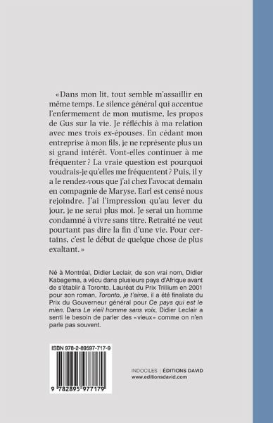 «Dans mon lit, tout semble m’assaillir en même temps. Le silence général qui accentue l’enfermement de mon mutisme, les propos de Gus sur la vie. Je réfléchis à ma relation avec mes trois ex-épouses. En donnant les rênes de mon entreprise à mon fils, je ne représente plus un si grand intérêt. Vont-elles continuer à me fréquenter ? La vraie question est pourquoi voudrais-je qu’elles me fréquentent ? Puis, il y a le rendez-vous que j’ai chez l’avocat demain en compagnie de Maryse. Earl est censé nous rejoindre. J’ai l’impression qu’au lever du jour, je ne serai plus moi. Je serai un homme condamné à vivre sans titre. Retraité ne veut pourtant pas dire la fin d’une vie. Pour certains, c’est le début de quelque chose de plus exaltant.»