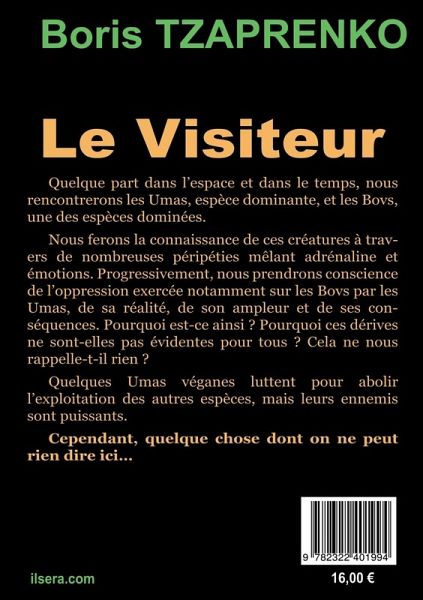 Quelque part dans l'espace et dans le temps, nous rencontrerons les Umas, espèce dominante, et les Bovs, une des espèces dominées.Nous ferons la connaissance de ces créatures à travers de nombreuses péripéties mêlant adrénaline et émotions. Progressivement, nous prendrons conscience de l'oppression exercée notamment sur les Bovs par les Umas, de sa réalité, de son ampleur et de ses conséquences. Pourquoi est-ce ainsi ? Pourquoi ces dérives ne sont-elles pas évidentes pour tous ? Cela ne nous rappelle-t-il rien ?Quelques Umas véganes luttent pour abolir l'exploitation des autres espèces, mais leurs ennemis sont puissants.Cependant, quelque chose dont on ne peut rien dire ici...