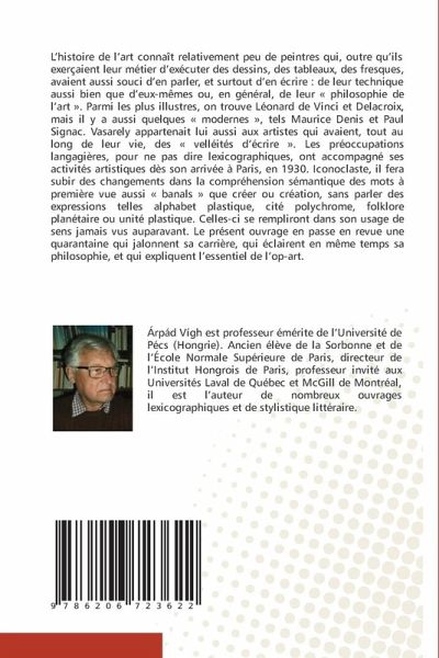L'histoire de l'art connaît relativement peu de peintres qui, outre qu'ils exerçaient leur métier d'exécuter des dessins, des tableaux, des fresques, avaient aussi souci d'en parler, et surtout d'en écrire : de leur technique aussi bien que d'eux-mêmes ou, en général, de leur « philosophie de l'art ». Parmi les plus illustres, on trouve Léonard de Vinci et Delacroix, mais il y a aussi quelques « modernes », tels Maurice Denis et Paul Signac. Vasarely appartenait lui aussi aux artistes qui avaient, tout au long de leur vie, des « velléités d'écrire ». Les préoccupations langagières, pour ne pas dire lexicographiques, ont accompagné ses activités artistiques dès son arrivée à Paris, en 1930. Iconoclaste, il fera subir des changements dans la compréhension sémantique des mots à première vue aussi « banals » que créer ou création, sans parler des expressions telles alphabet plastique, cité polychrome, folklore planétaire ou unité plastique. Celles-ci se rempliront dans son usage de sens jamais vus auparavant. Le présent ouvrage en passe en revue une quarantaine qui jalonnent sa carrière, qui éclairent en même temps sa philosophie, et qui expliquent l'essentiel de l'op-art.