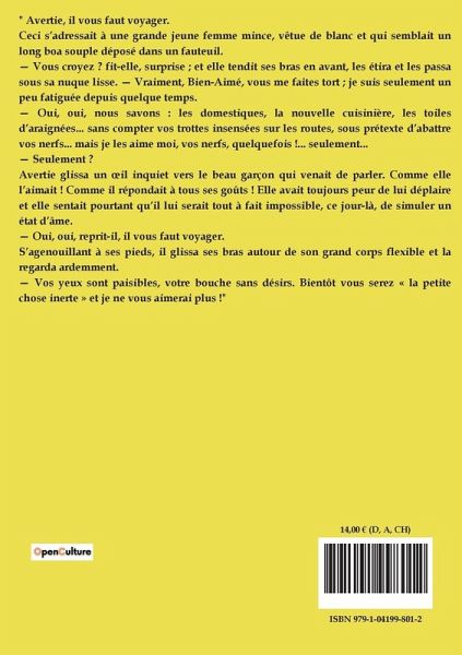 " Avertie, il vous faut voyager. Ceci s¿adressait à une grande jeune femme mince, vêtue de blanc et qui semblait un long boa souple déposé dans un fauteuil. ¿ Vous croyez ? fit-elle, surprise ; et elle tendit ses bras en avant, les étira et les passa sous sa nuque lisse. ¿ Vraiment, Bien-Aimé, vous me faites tort ; je suis seulement un peu fatiguée depuis quelque temps. ¿ Oui, oui, nous savons : les domestiques, la nouvelle cuisinière, les toiles d¿araignées... sans compter vos trottes insensées sur les routes, sous prétexte d¿abattre vos nerfs... mais je les aime moi, vos nerfs, quelquefois !... seulement... ¿ Seulement ? Avertie glissa un ¿il inquiet vers le beau garçon qui venait de parler. Comme elle l¿aimait ! Comme il répondait à tous ses goûts ! Elle avait toujours peur de lui déplaire et elle sentait pourtant qüil lui serait tout à fait impossible, ce jour-là, de simuler un état d¿âme. ¿ Oui, oui, reprit-il, il vous faut voyager. S¿agenouillant à ses pieds, il glissa ses bras autour de son grand corps flexible et la regarda ardemment. ¿ Vos yeux sont paisibles, votre bouche sans désirs. Bientôt vous serez « la petite chose inerte » et je ne vous aimerai plus !"