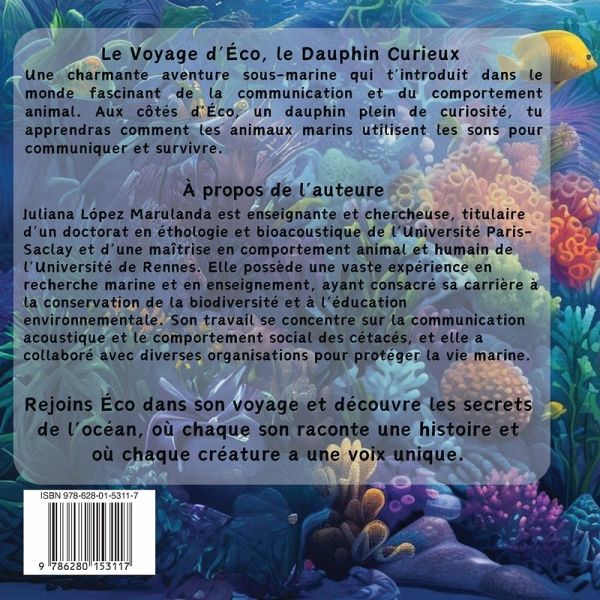 Titre du Livre: Le Voyage d'Éco, le Dauphin Curieux Description: Accompagne Éco, un jeune dauphin curieux, dans une aventure magique sous-marine où tu découvriras comment les animaux marins utilisent les sons pour communiquer et survivre. Écrit par la Dre Juliana López Marulanda, experte en éthologie et bioacoustique, Le Voyage d'Éco combine science et divertissement, avec des illustrations attrayantes et des sons marins réels enregistrés par l'auteure, accessibles via des codes QR. Chapitres Clés: * Une journée dans l'océan: Éco apprend les sons de l'océan avec sa mère. * Rencontre avec Grand-mère: La grand-mère d'Éco lui révèle les secrets des sons marins. * Les dauphins et leurs signatures sifflées: Éco découvre les sifflements uniques de chaque dauphin. * Les chants des baleines: Éco écoute les chansons des baleines à bosse. * Le Cachalot et l'echolocalisation: Éco apprend l'écholocalisation et comment naviguer. Caractéristiques: * Illustrations interactives: Profite d'images colorées qui accompagnent l'histoire. * Codes QR avec des sons réels de l'océan: Écoute les sons marins enregistrés par l'auteure. * Thèmes éducatifs: Introduit les enfants à la bioacoustique et à la conservation marine.