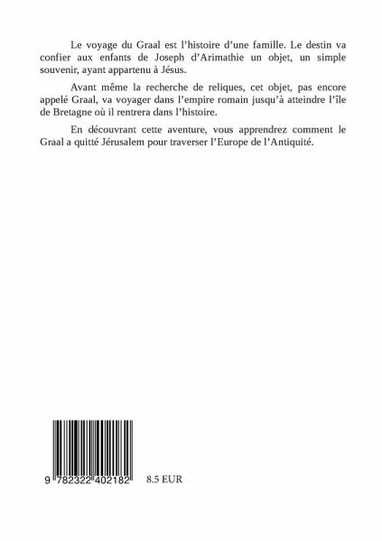 Le voyage du Graal est l'histoire d'une famille. Le destin va confier aux enfants de Joseph d'Arimathie un objet, un simple souvenir, ayant appartenu à Jésus.Avant même la recherche de reliques, cet objet, pas encore appelé Graal, va voyager dans l'empire romain jusqu'à atteindre l'île de Bretagne où il rentrera dans l'histoire.En lisant cette aventure, vous apprendrez comment le Graal a quitté Jérusalem pour traverser l'Europe de l'Antiquité.