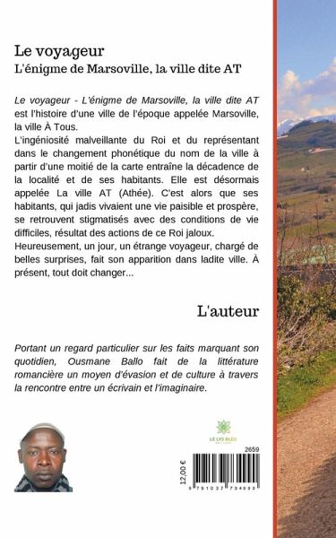 Le voyageur - L'énigme de Marsoville, la ville dite AT est l'histoire d'une ville de l'époque appelée Marsoville, la ville À Tous. L'ingéniosité malveillante du Roi et du représentant dans le changement phonétique du nom de la ville à partir d'une moitié de la carte entraîne la décadence de la localité et de ses habitants. Elle est désormais appelée La ville AT (Athée). C'est alors que ses habitants, qui jadis vivaient une vie paisible et prospère, se retrouvent stigmatisés avec des conditions de vie difficiles, résultat des actions de ce Roi jaloux. Heureusement, un jour, un étrange voyageur, chargé de belles surprises, fait son apparition dans ladite ville. À présent, tout doit changer...