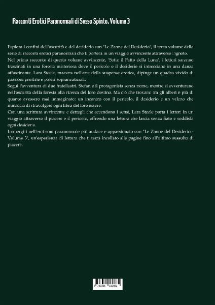 Esplora i confini dell'oscurità e del desiderio con "Le Zanne del Desiderio", il terzo volume della serie di racconti erotici paranormali che ti porterà in un viaggio avvincente attraverso l'ignoto.Nel primo racconto di questo volume avvincente, "Sotto il Patto della Luna", i lettori saranno trascinati in una foresta misteriosa dove il pericolo e il desiderio si intrecciano in una danza affascinante. Lara Steele, maestra nell'arte della suspense erotica, dipinge un quadro vivido di passioni proibite e poteri soprannaturali.Segui l'avventura di due fratellastri, Stefan e il protagonista senza nome, mentre si avventurano nell'oscurità della foresta alla ricerca del loro destino. Ma ciò che trovano tra gli alberi è più di quanto avessero mai immaginato: un incontro con il pericolo, il desiderio e un veleno che minaccia di stravolgere ogni fibra del loro essere.Con una scrittura avvincente e dettagli che accendono i sensi, Lara Steele porta i lettori in un viaggio attraverso il piacere e il pericolo, offrendo una lettura che lascia senza fiato e soddisfa ogni desiderio.Immergiti nell'erotismo paranormale più audace e appassionato con "Le Zanne del Desiderio - Volume 3", un'esperienza di lettura che ti terrà incollato alle pagine fino all'ultimo sussulto di piacere.