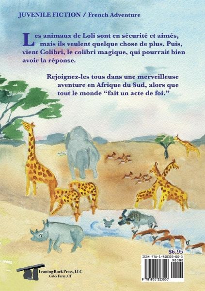 Loli’s paper animals are safe and loved, but they want something more. Then along comes Colibri, the magical hummingbird, who might just have the answer. Join them all on a wondrous adventure to South Africa as everyone "takes a leap of faith." A song is embedded within the story and the musical score is included, offering the opportunity to utilize Comprehensive Input in the world language classroom. It is most beneficial for language learners to hear the cadence of the target language along with colorful artwork to help them actively acquire meaning at their individual pace. Les animaux de Loli sont en sécurité et aimés, mais ils veulent quelque chose de plus. Puis, vient Colibri, le colibri magique, qui pourrait bien avoir la réponse. Rejoignez-les tous dans une merveilleuse aventure en Afrique du Sud, alors que tout le monde "fait un acte de foi." Une chanson est intégrée à l’histoire et la partition est incluse, qui offre la possibilité d'utiliser entrée complète dans la classe de langue mondial. C'est le plus bénéfique pour les apprenants de langue d'entendre la cadence de la langue avec l'art pour les aider à acquérir activement du sens à leur rythme individuel.