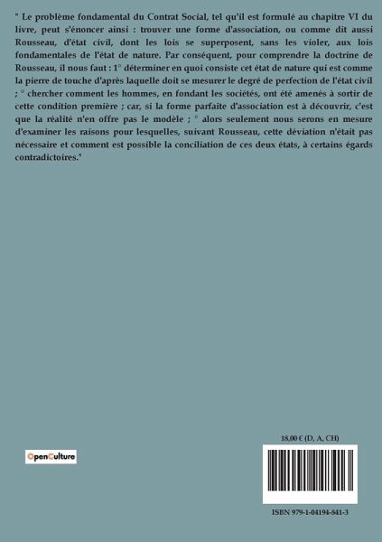 " Le problème fondamental du Contrat Social, tel qu'il est formulé au chapitre VI du livre, peut s'énoncer ainsi : trouver une forme d'association, ou comme dit aussi Rousseau, d'état civil, dont les lois se superposent, sans les violer, aux lois fondamentales de l'état de nature. Par conséquent, pour comprendre la doctrine de Rousseau, il nous faut : 1° déterminer en quoi consiste cet état de nature qui est comme la pierre de touche d'après laquelle doit se mesurer le degré de perfection de l'état civil ; ° chercher comment les hommes, en fondant les sociétés, ont été amenés à sortir de cette condition première ; car, si la forme parfaite d'association est à découvrir, c'est que la réalité n'en offre pas le modèle ; ° alors seulement nous serons en mesure d'examiner les raisons pour lesquelles, suivant Rousseau, cette déviation n'était pas nécessaire et comment est possible la conciliation de ces deux états, à certains égards contradictoires."