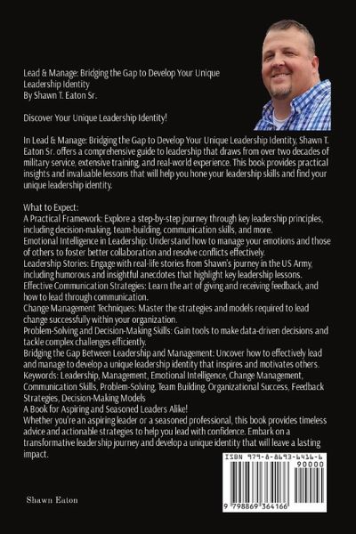 Lead & Manage: Bridging the Gap to Develop Your Unique Leadership Identity By Shawn T. Eaton Sr. Discover Your Unique Leadership Identity! In Lead & Manage: Bridging the Gap to Develop Your Unique Leadership Identity, Shawn T. Eaton Sr. offers a comprehensive guide to leadership that draws from over two decades of military service, extensive training, and real-world experience. This book provides practical insights and invaluable lessons that will help you hone your leadership skills and find your unique leadership identity. What to Expect: - A Practical Framework: Explore a step-by-step journey through key leadership principles, including decision-making, team building, communication skills, and more. - Emotional Intelligence in Leadership: Understand how to manage your emotions and those of others to foster better collaboration and resolve conflicts effectively. - Leadership Stories: Engage with real-life stories from Shawn's journey in the US Army, including humorous and insightful anecdotes that highlight key leadership lessons. - Effective Communication Strategies: Learn the art of giving and receiving feedback, and how to lead through communication. - Change Management Techniques: Master the strategies and models required to lead change successfully within your organization. - Problem-Solving and Decision-Making Skills: Gain tools to make data-driven decisions and tackle complex challenges efficiently. - Bridging the Gap Between Leadership and Management: Uncover how to effectively lead and manage to develop a unique leadership identity that inspires and motivates others. A Book for Aspiring and Seasoned Leaders Alike! Whether you're an aspiring leader or a seasoned professional, this book provides timeless advice and actionable strategies to help you lead with confidence. Embark on a transformative leadership journey and develop a unique identity that will leave a lasting impact. Order your copy now and start your journey to becoming the leader you were meant to be!