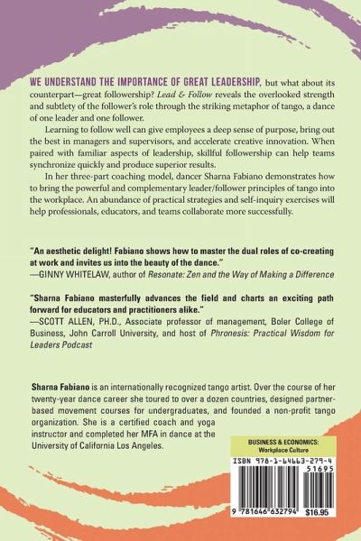 We understand the importance of great leadership, but what about its counterpart-great followership? Lead & Follow reveals the overlooked strength and subtlety of the follower's role through the striking metaphor of tango, a dance of one leader and one follower. Learning to follow well can give employees a deep sense of purpose, bring out the best in managers and supervisors, and accelerate creative innovation. When paired with familiar aspects of leadership, skillful followership can help teams synchronize quickly and produce superior results. In her three-part coaching model, dancer Sharna Fabiano demonstrates how to bring the powerful and complementary leader/follower principles of tango into the workplace. An abundance of practical strategies and self-inquiry exercises will help professionals, educators, and teams collaborate more successfully.
