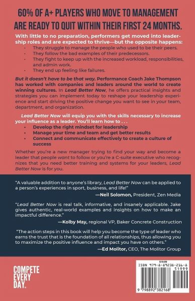 60% of A+ players who move to management are ready to quit within their first 24 months. With little to no preparation, performers get moved into leadership roles and are expected to thrive-but the opposite happens:They struggle to manage the people who used to be their peers. They follow the bad examples of their predecessors. They fight to keep up with the increased workload, responsibilities, and admin work. They end up feeling like failures. But it doesn't have to be that way. Performance Coach Jake Thompson has worked with companies and leaders around the world to create winning cultures. In Lead Better Now, he offers practical insights and strategies you can implement today to reshape your leadership experience and start driving the positive change you want to see in your team, department, and organization. Lead Better Now will equip you with the skills necessary to increase your influence as a leader. You'll learn how to . . .Develop the right mindset for leadership Manage your time and team and get better results Connect and communicate effectively to create a culture of success Whether you're a new manager trying to find your way and become a leader that people want to follow or you're a C-suite executive who recognizes that you need better training and systems for your leaders, Lead Better Now is for you. "A valuable addition to anyone's library, Lead Better Now can be applied to a person's experiences in sport, business, and life!" -Neil Solomon, dedicated coach and committed leader, president of Zen Media "Lead Better Now is real talk, informative, and insanely applicable. Jake gives authentic, real-world examples and insights on how to make an impactful difference." -Kolby May, regional VP, Osburn Contractors "The action steps in this book will help you become the type of leader who earns the trust that is the foundation of all relationships, thus allowing you to maximize the positive influence and impact you have on others." -Ed Molitor, CEO of The Molitor Group, executive coach, and host of The Athletics of Business podcast