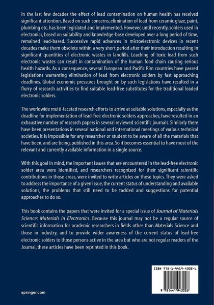 This material originally appeared in a special issue of Journal of Materials Science: Materials in Electronics. Because this journal may not be a regular source of scientific information foracademic researchers in fields other than Materials Science and those in industry, and to provide wider awareness of the current status of lead-free electronic solders to those persons active in the area but who are not regular readers of the Journal, these articles are being reprinted in book form.