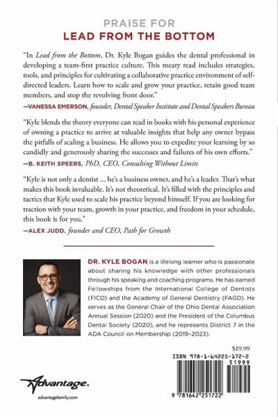 PRAISE FOR LEAD FROM THE BOTTOM "In Lead from the Bottom, Dr. Kyle Bogan guides the dental professional in developing a team-first practice culture. This meaty read includes strategies, tools, and principles for cultivating a collaborative practice environment of self-directed leaders. Learn how to scale and grow your practice, retain good team members, and stop the revolving front door." -VANESSA EMERSON, founder, Dental Speaker Institute and Dental Speakers Bureau "Kyle blends the theory everyone can read in books with his personal experience of owning a practice to arrive at valuable insights that help any owner bypass the pitfalls of scaling a business. He allows you to expedite your learning by so candidly and generously sharing the successes and failures of his own efforts." -B. KEITH SPEERS, PhD, CEO, Consulting Without Limits "Kyle is not only a dentist ... he's a business owner, and he's a leader. That's what makes this book invaluable. It's not theoretical. It's filled with the principles and tactics that Kyle used to scale his practice beyond himself. If you are looking for traction with your team, growth in your practice, and freedom in your schedule, this book is for you." -ALEX JUDD, founder and CEO, Path for Growth