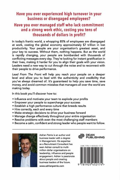 Have you ever experienced high turnover in your business or disengaged employees? Have you ever managed staff who lack commitment and a strong work ethic, costing you tens of thousands of dollars in profit? In today’s frantic world, a whopping 85% of employees are disengaged at work, costing the global economy approximately $7 trillion in lost productivity. Your people are your organisation’s greatest asset, and your key to success. Without them, nothing happens. But as the world is rapidly changing, your people are bombarded with thousands of conflicting messages every day. They’re looking for instant gratification in their lives, making it harder for you to align their goals with your vision. Leaders need a new way to cut through the noise and to reconnect with their people to drive performance. Lead From The Front will help you reach your people on a deeper level and allow you to lead with the authenticity and credibility that you’ve always dreamed of. It’s guaranteed to help you save time, save money, and avoid common mistakes that managers all over the world are making today. In this book you’ll discover how to: Influence and motivate your team to explode your profits Empower your people to supercharge your success Establish a high-performance culture that breeds results Hire correctly, each and every time Make strategic decisions to drive your business forward Manage change effectively throughout your entire organisation Resolve problems with even the most challenging staff members Become a calm, confident and strong leader who people want to follow Adrian Petrie is an author and business leader with a degree in Management. His expertise as a Recruitment Consultant has seen Adrian consult to multi-million dollar organisations on leadership, influence and people engagement. Adrian is passionate about people and creating business leaders of the future.