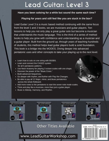 Have you been soloing for a while but sound the same each time? Playing for years and still feel like you are stuck in the box? Lead Guitar Level 3 is a music based method continuing with the same focus from the level 1 and 2 books, we are musicians and guitar players. Ten lessons to help you not only play a great guitar solo but become a musician that understands the music language. This is the third of a series of method books to help you grow with confidence and understanding as a musician and a guitar player. Built from the ground up, through years of teaching hundreds of students, this method helps lead guitar players build a solid foundation. This book is a bridge into the MODES. Diving deeper into advanced pentatonic uses and other concepts to take your playing up to the next level. * Learn how to solo on one string with BSSBS. * Learn and connect the CAGED system for all 5 pentatonic patterns. * How to use Neck Anatomy for playing 3 octave scales with one shape. * Discover the power of the "Blues Cross." * Build advanced Sequences. * Go deeper with rhythm, and further with Play the Changes. * Be able to pay all 12 Major, minor, and blues pentatonics across the whole fretboard. * Add more notes to the pentatonic to start the seven note mode scales. * Think and play like a musician, more than just a guitar player. * Music is Melody, Harmony, and Rhythm. These books are the cumulative result of thirty five years of playing guitar, professionally playing for over twenty eight years and performing over two thousand shows nationally. These books were developed for over seventeen years while teaching in NYC averaging over fifty students a week in small groups and private lessons. Hundreds and hundreds of students all having the same goal to learn lead guitar. So many of them having similar issues and misunderstandings about guitar and music.