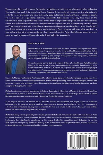 The concept of this book is meant for Leaders in Healthcare but it can help leaders in other industries. The goal of this book is to teach healthcare leaders the necessity to focus on the big picture in order to create strategies and have extremely good outcomes. Healthcare leaders often get lost in the noise of regulations, patient complaints, and labor issues. These challenges can distract them from the fundamentals of prioritization and reaching organizational goals. Instead of being engrossed in the micro-processes, leaders should focus on the big-picture items that impact day-to-day operations. Drawing from 15 years of experience as a healthcare executive and Regional Vice President, Michael Rivera teaches readers a structured framework for leading by design in healthcare and beyond. Backed up by specific strategies and real-life examples, this book presents six core pillars for new or seasoned leaders to take the helm with structure while empowering employees for long-term success and transformation.