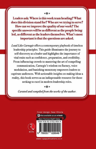 Leaders ask: Where is this work team heading? What does this division stand for? Who are we trying to serve? How can we improve the quality of our work? The specific answers will be as different as the people being led, as different as the leaders themselves. What's most important is that the questions are asked. Lead Like Carnegie offers a contemporary playbook of timeless leadership principles. This guide illuminates the journey to self-discovery as a leader and highlights the importance of vital traits such as confidence, preparation, and credibility. From influencing crowds to mastering the art of compelling communication, Carnegie's wisdom on fluency, voice modulation, and banishing monotony empowers leaders to captivate audiences. With actionable insights on making ideas a reality, this book serves as an indispensable resource for those seeking to excel in modern leadership roles. Curated and compiled from the works of the author.