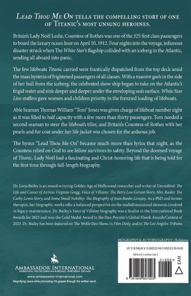 Lead Thou Me On tells the compelling story of one of Titanic's most unsung heroines. Britain's Lady Noël Leslie, Countess of Rothes was one of the 325 first class passengers to board the luxury ocean liner on April 10, 1912. Four nights into the voyage, infamous disaster struck when The White Star's flagship collided with an iceberg in the Atlantic, sending all aboard into panic. The few lifeboats Titanic carried were frantically dispatched from the top deck amid the mass hysteria of frightened passengers of all classes. With a massive gash in the side of her hull from the iceberg, the celebrated show ship began to take on the Atlantic's frigid water and sink deeper and deeper under the enveloping sea's surface. White Star Line staffers gave women and children priority in the frenzied loading of lifeboats. Able Seaman Thomas William "Tom" Jones was given charge of lifeboat number eight as it was filled to half capacity with a few more than thirty passengers. Tom needed a second seaman to steer the lifeboat's tiller, and Britain's Countess of Rothes with her pearls and fur coat under her life jacket was chosen for the arduous job. The hymn "Lead Thou Me On" became much more than lyrics that night, as the Countess relied on God to see fellow survivors to safety. Beyond the doomed voyage of Titanic, Lady Noël had a fascinating and Christ-honoring life that is being told for the first time through full-length biography.