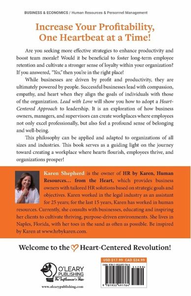 Increase Your Profitability, One Heartbeat at a Time! Are you seeking more effective strategies to enhance productivity and boost team morale? Would it be beneficial to foster long-term employee retention and cultivate a stronger sense of loyalty within your organization? If you answered, "Yes," then you're in the right place! While businesses are driven by profit and productivity, they are ultimately powered by people. Successful businesses lead with compassion, empathy, and heart when they align the goals of individuals with those of the organization. Lead with Love will show you how to adopt a Heart-Centered Approach to leadership. It is an exploration of how business owners, managers, and supervisors can create workplaces where employees not only excel professionally, but also feel a profound sense of belonging and well-being. This philosophy can be applied and adapted to organizations of all sizes and industries. This book serves as a guiding light on the journey toward creating a workplace where hearts flourish, employees thrive, and organizations prosper!