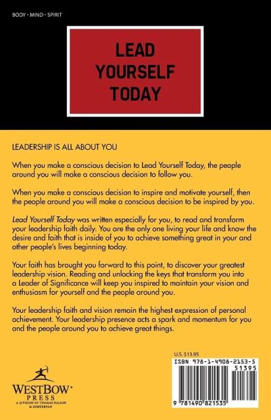 LEADERSHIP IS ALL ABOUT YOU When you make a conscious decision to Lead Yourself Today, the people around you will make a conscious decision to follow you. When you make a conscious decision to inspire and motivate yourself, then the people around you will make a conscious decision to be inspired by you. Lead Yourself Today was written especially for you, to read and transform your leadership faith daily. You are the only one living your life and know the desire and faith that is inside of you to achieve something great in your and other people's lives beginning today. Your faith has brought you forward to this point, to discover your greatest leadership vision. Reading and unlocking the keys that transform you into a Leader of Significance will keep you inspired to maintain your vision and enthusiasm for yourself and the people around you. Your leadership faith and vision remain the highest expression of personal achievement. Your leadership presence acts as a spark and momentum for you and the people around you to achieve great things.
