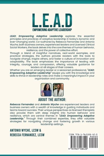 LEAD: Empowering Adaptive Leadership explores the essential principles and practices of adaptive leadership in today's dynamic and ever-changing world. Co-authored by Rebecca Fernandez and Antonio Wyche, both business owners, experienced leaders and Licensed Clinical Social Workers, the book delves into the core themes of human behavior, resilience, and the power of collective effort. Through a blend of insightful narratives, real-world examples, and practical strategies, the authors provide readers with the tools to navigate change, inspire others, and foster a culture of innovation and adaptability. The book emphasizes the importance of leading with integrity, courage, and compassion, offering valuable guidance for leaders at all stages of their careers. Whether you are an emerging leader or a seasoned professional, "LEAD: Empowering Adaptive Leadership" equips you with the knowledge and skills to thrive in leadership roles and make a meaningful impact in your organization and community.
