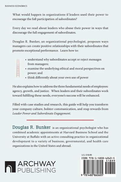 What would happen in organizations if leaders used their power to encourage the full participation of subordinates? Every day we read about leaders who abuse their power in ways that discourage the full engagement of subordinates. Douglas R. Bunker, an organizational psychologist, proposes ways managers can create positive relationships with their subordinates that promote exceptional performance. Learn how to: understand why subordinates accept or reject messages from managers; examine the underlying ethical and moral perspectives on power; and think differently about your own use of power He also explains how to address the three fundamental needs of employees: agency, growth, and justice. When leaders and their subordinates work toward fulfilling these needs, everyones success will be enhanced. Filled with case studies and research, this guide will help you transform your company culture, bolster communication, and reap rewards from Leader Power and Subordinate Engagement.