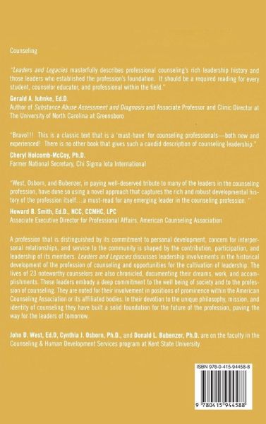 A profession that is distinguished by its commitment to personal development, concern for interpersonal relationships and service to the community is shaped by the contribution, participation and leadership of its members. This book discusses leadership involvements in the historical development of the profession of counselling and opportunities for the cultivation of leadership. The lives of 23 noteworthy counsellors are chronicled, documenting their dreams, work and accomplishments. These leaders embody a deep commitment to the well-being of society and to the profession of counselling.