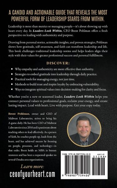 Dig deep to understand what's in your heart to help you unleash the true leader spirit inside of you The corporate world can be demanding when success is only measured in KPIs and numbers. Even if positive results happen on paper, you have more to offer your company, but now feel like just another person who goes to work each day to do a job that has to be done. Leadership isn't easy. But you have the power to lead in your hand when you start from within. Brent Pohlman, owner and CEO of Midwest Laboratories, broke through the same challenges to find success by unleashing his entrepreneurial spirit. A person of deep faith, he coaches people to lead from the heart. In Leaders Look Within, he shows you how to achieve the business role you dream of by learning how to develop leadership skills through self-examination and gratitude. His inspirational guide includes management habits and practical lessons you can apply to change your work and personal life for the better. You'll discover:A strategic plan to transform teamwork with people who share your strong values, resulting in a more remarkable work environment. An effortless gratitude practice that frees you to live with a positive attitude and purpose while showing others love and concern. A daily routine to bring your A-game every day focusing on the benefits of work life balance, resulting in greater trust, power, emotional intelligence, and productivity. Tools and methods to pull out your optimal energy to achieve more while being an effective leader. Questions to discover what is holding you back from being the leader you want to be. Leaders Look Within will take you on a smart, reflective journey and convince you that the only way to lead is by having the courage to do so from the heart. Start with the first step: Read Leaders Look Within to own who you are and become the CEO of your heart.