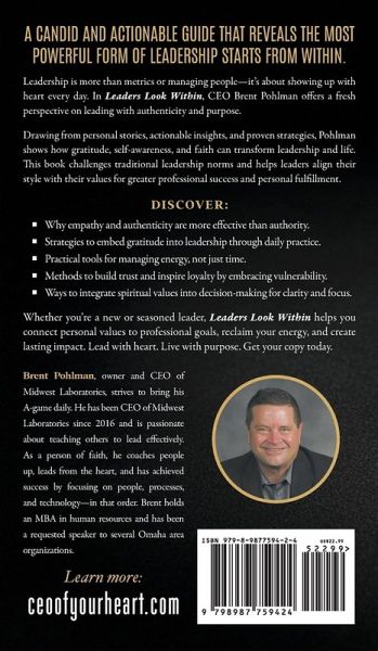 Dig deep to understand what's in your heart to help you unleash the true leader spirit inside of you The corporate world can be demanding when success is only measured in KPIs and numbers. Even if positive results happen on paper, you have more to offer your company, but now feel like just another person who goes to work each day to do a job that has to be done. Leadership isn't easy. But you have the power to lead in your hand when you start from within. Brent Pohlman, owner and CEO of Midwest Laboratories, broke through the same challenges to find success by unleashing his entrepreneurial spirit. A person of deep faith, he coaches people to lead from the heart. In Leaders Look Within, he shows you how to achieve the business role you dream of by learning how to develop leadership skills through self-examination and gratitude. His inspirational guide includes management habits and practical lessons you can apply to change your work and personal life for the better. You'll discover:A strategic plan to transform teamwork with people who share your strong values, resulting in a more remarkable work environment. An effortless gratitude practice that frees you to live with a positive attitude and purpose while showing others love and concern. A daily routine to bring your A-game every day focusing on the benefits of work life balance, resulting in greater trust, power, emotional intelligence, and productivity. Tools and methods to pull out your optimal energy to achieve more while being an effective leader. Questions to discover what is holding you back from being the leader you want to be. Leaders Look Within will take you on a smart, reflective journey and convince you that the only way to lead is by having the courage to do so from the heart. Start with the first step: Read Leaders Look Within to own who you are and become the CEO of your heart.