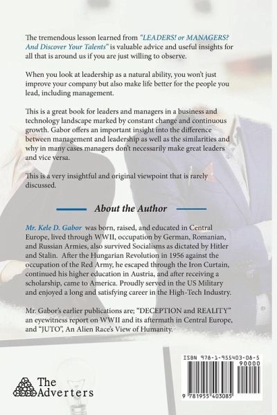 The tremendous lesson learned from "LEADERS! or MANAGERS? And Discover Your Talents" is valuable advice and useful insights for all that is around us if you are just willing to observe. When you look at leadership as a natural ability, you won't just improve your company but also make life better for the people you lead, including management. This is a great book for leaders and managers in a business and technology landscape marked by constant change and continuous growth. Gabor offers an important insight into the difference between management and leadership as well as the similarities and why in many cases managers don't necessarily make great leaders and vice versa. This is a very insightful and original viewpoint that is rarely discussed.