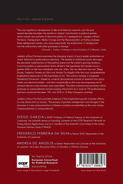 Leaders without Partisans examines the changing impact of party leader evaluations on voters' behavior in parliamentary elections. The decline of traditional social cleavages, the pervasive mediatization of the political scene, and the media's growing tendency to portray politics in "personalistic" terms all led to the hypothesis that leaders matter more for the way individuals vote and, often, the way elections turn out. This study offers the most comprehensive longitudinal assessment of this hypothesis so far. The authors develop a composite theoretical framework - based on currently disconnected strands of research from party, media, and electoral studies - and test it empirically on the most encompassing set of national election study datasets ever assembled. The labor-intensive harmonization effort produces an unprecedented dataset pooling information for a total of 129 parliamentary elections conducted between 1961 and 2018 in 14 West European countries. The book provides evidence of the longitudinal growth in leader effects on vote choice and on turnout. The process of partisan dealignment and changes in the structure of mass communication in Western societies are identified as the main drivers of personalization in voting behavior