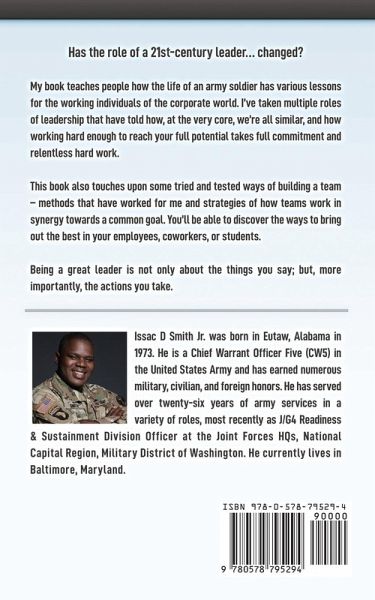 Has the role of a 21st-century leader... changed? My book teaches people how the life of an army soldier has various lessons for the working individuals of the corporate world. I've taken multiple roles of leadership that have told how, at the very core, we're all similar, and how working hard enough to reach your full potential takes full commitment and relentless hard work. This book also touches upon some tried and tested ways of building a team - methods that have worked for me and strategies of how teams work in synergy towards a common goal. You'll be able to discover the ways to bring out the best in your employees, coworkers, or students. Being a great leader is not only about the things you say; but, more importantly, the actions you take.