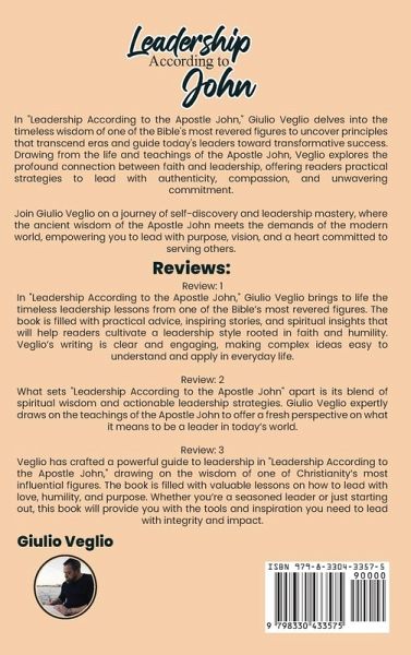 In "Leadership According to the Apostle John, Giulio Veglio delves into the timeless wisdom of one of the Bible's most revered figures to uncover principles that transcend eras and guide today's leaders toward transformative success. Drawing from the life and teachings of the Apostle John, Veglio explores the profound connection between faith and leadership, offering readers practical strategies to lead with authenticity, compassion, and unwavering commitment. Join Giulio Veglio on a journey of self-discovery and leadership mastery, where the ancient wisdom of the Apostle John meets the demands of the modern world, empowering you to lead with purpose, vision, and a heart committed to serving others.