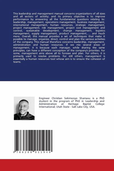 This leadership and management manual concerns organizations of all sizes and all sectors of activity; and its primary objective is to improve performance by answering all the fundamental questions relating to: leadership, management, operations management, business management, international management, human resources, strategic management, project management, risk management, project cost management and control, sustainable development, change management, logistics management, supply management, product management,.... and much more. Overall, this manual provides a set of techniques that make it possible to manage, organize, direct, control and plan the various activities of the company. This manual therefore concerns leadership, management, administration and human resources. If we mix several areas of management, it is because each manager, while sharing the same principles, can have a different conception of the company's priorities. For some, management aims above all to foresee and plan. For others, it is primarily used to resolve problems. For still others, management is essentially a human resources tool whose aim is to ensure the cohesion of teams.