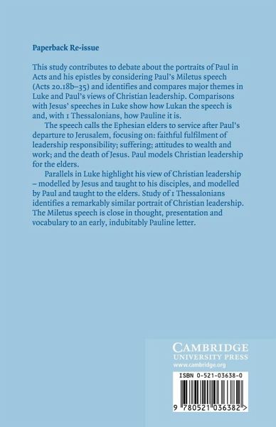 This study contributes to debate about the portraits of Paul in Acts and his epistles by considering Paul's Miletus speech (Acts 20.18b-35) and identifies and compares major themes in Luke and Paul's views of Christian leadership. Comparisons with Jesus' speeches in Luke show how Lukan the speech is and, with 1 Thessalonians, how Pauline it is. The speech calls the Ephesian elders to service after Paul's departure to Jerusalem, focusing on: faithful fulfilment of leadership responsibility; suffering; attitudes to wealth and work; and the death of Jesus. Paul models Christian leadership for the elders. Parallels in Luke highlight his view of Christian leadership - modelled by Jesus and taught to his disciples, and modelled by Paul and taught to the elders. Study of 1 Thessalonians identifies a remarkably similar portrait of Christian leadership. The Miletus speech is close in thought, presentation and vocabulary to an early, indubitably Pauline letter.